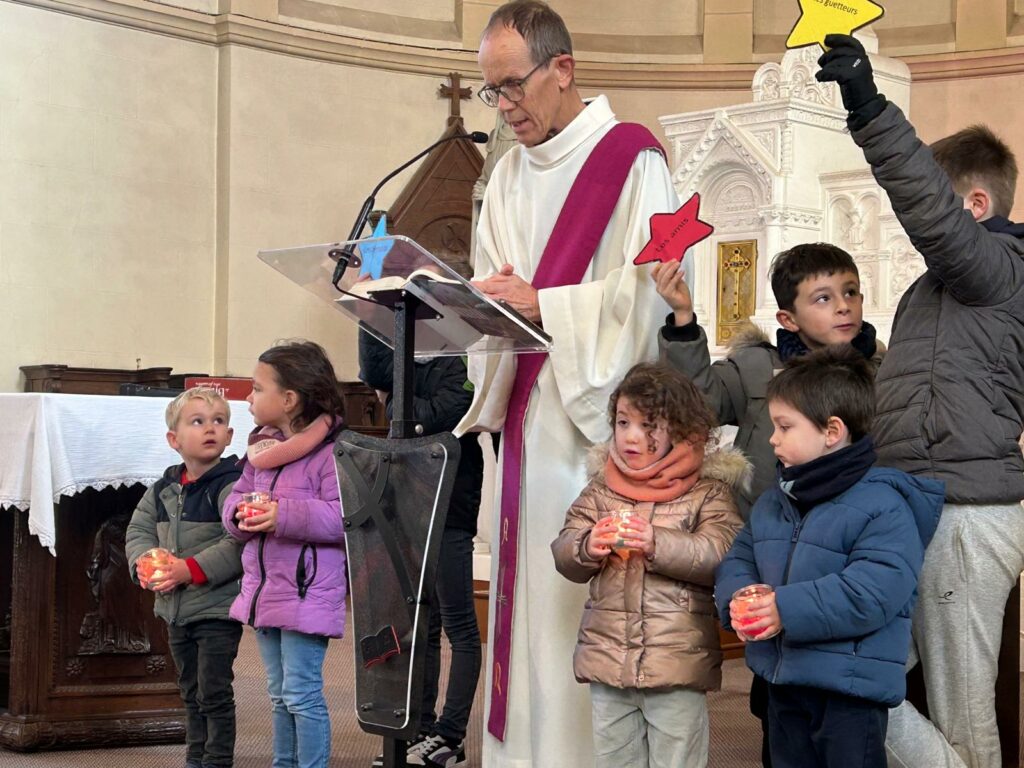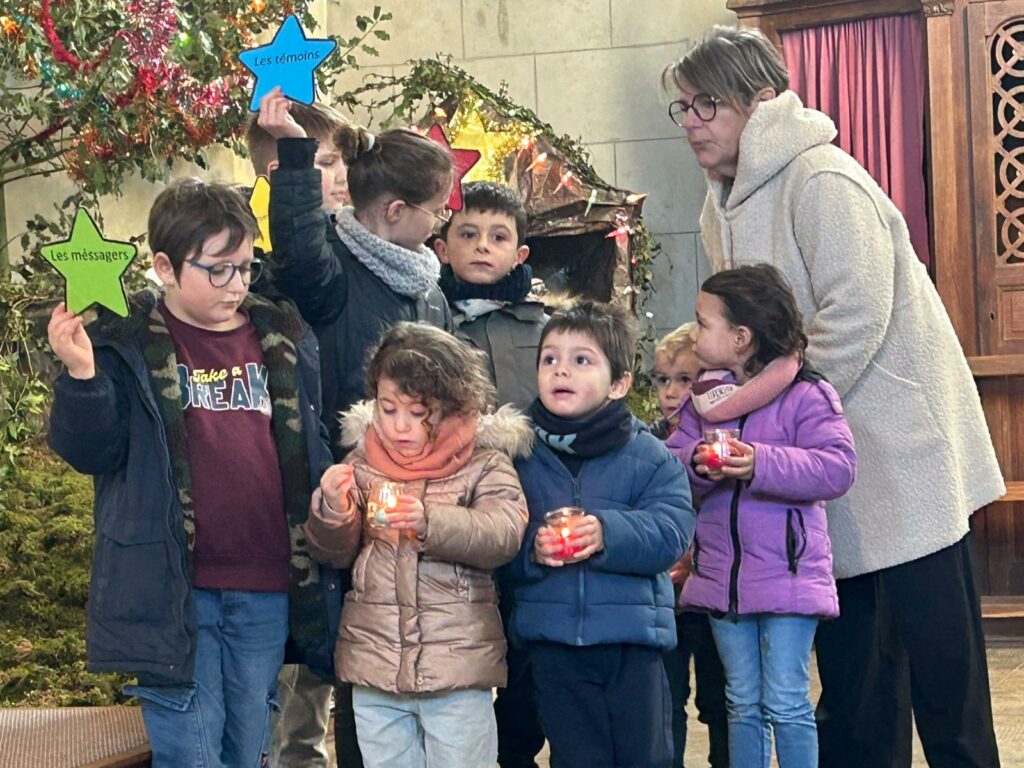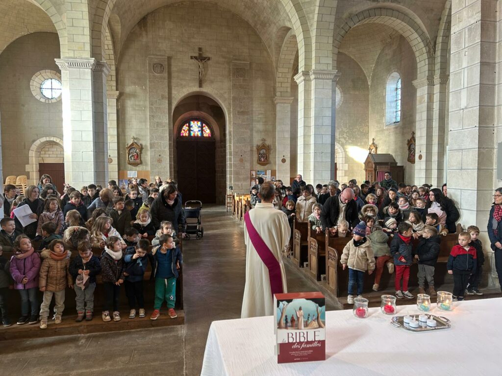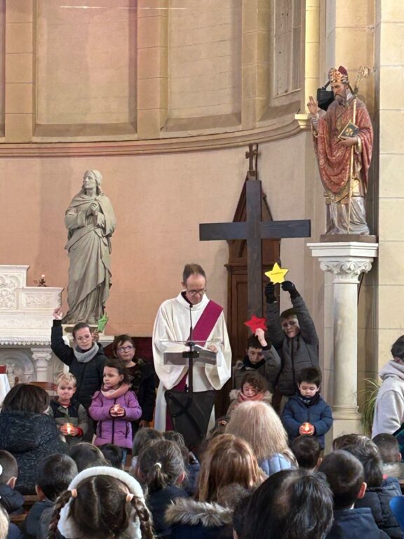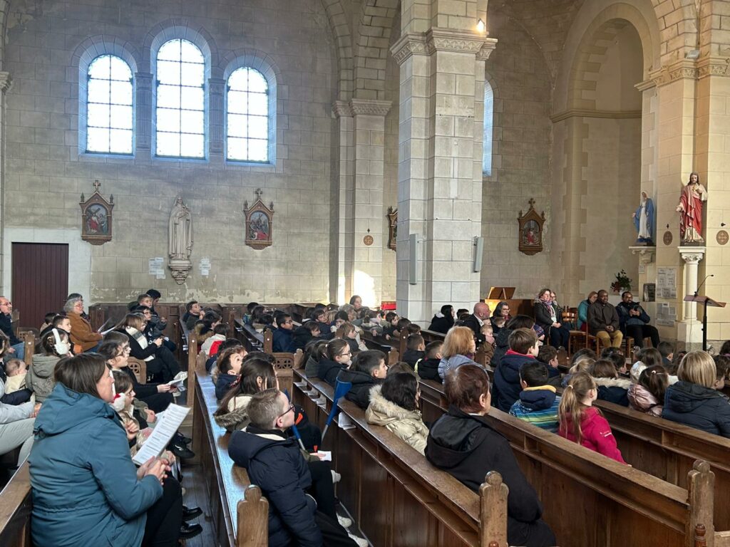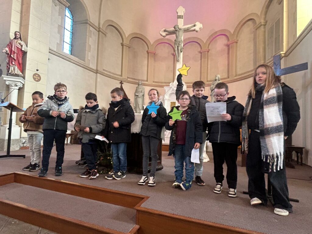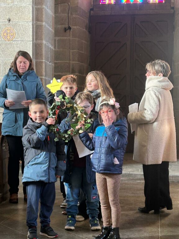 En ce mois de décembre, tous les élèves de l’école se sont réunis dans l’église de St Martin des Tilleuls pour retrouver les quelques parents et grands-parents qui avaient aussi fait le déplacement pour notre traditionnelle célébration.